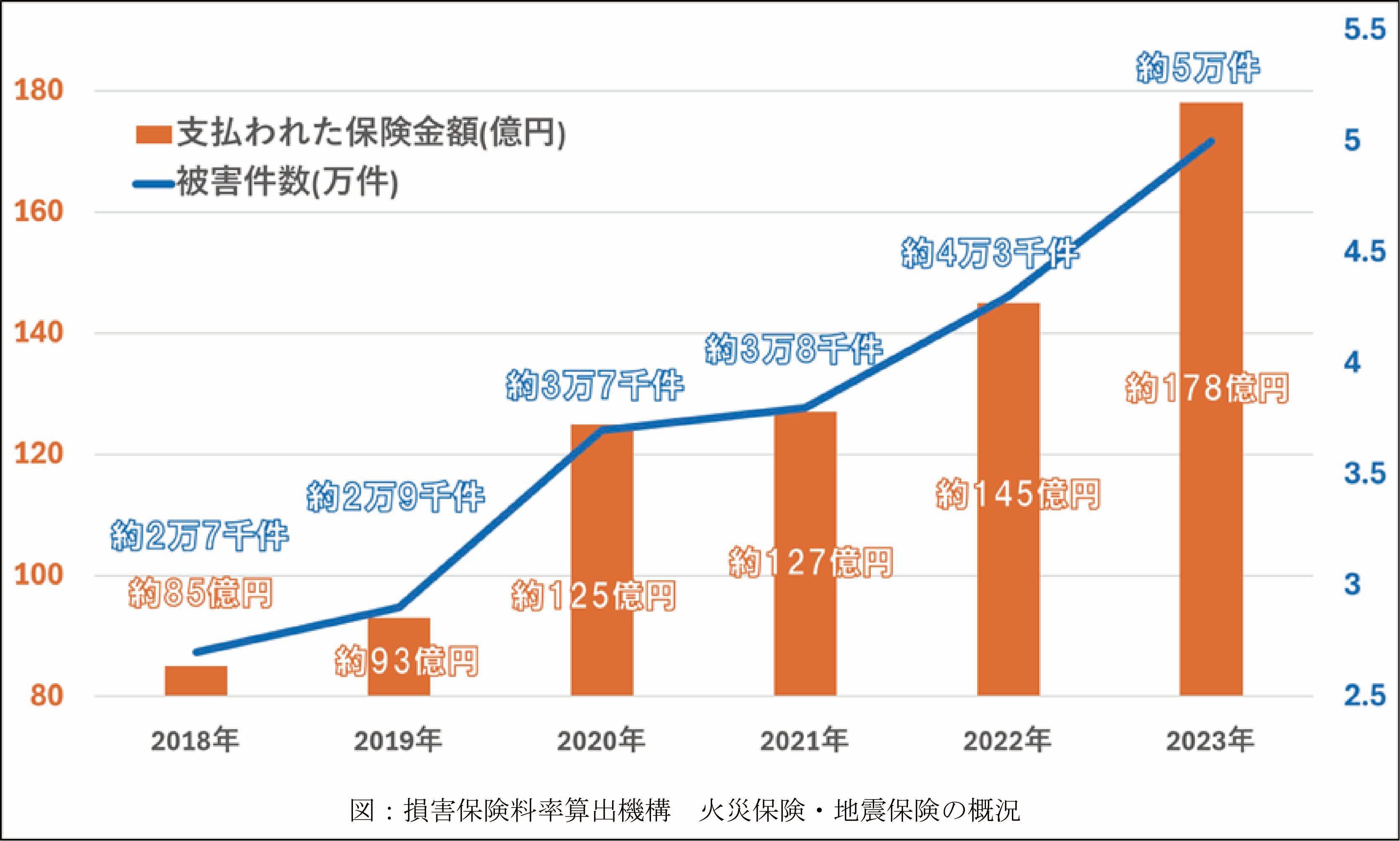 家電の雷被害は1990年代後半から増加しており、落雷による住宅被害の損害保険金も増え続けています。2023年には約5万件の被害が発生し、約178億円の保険金が支払われ、2018年と比べて件数は1.85倍、支払額は2倍に増加しています。
